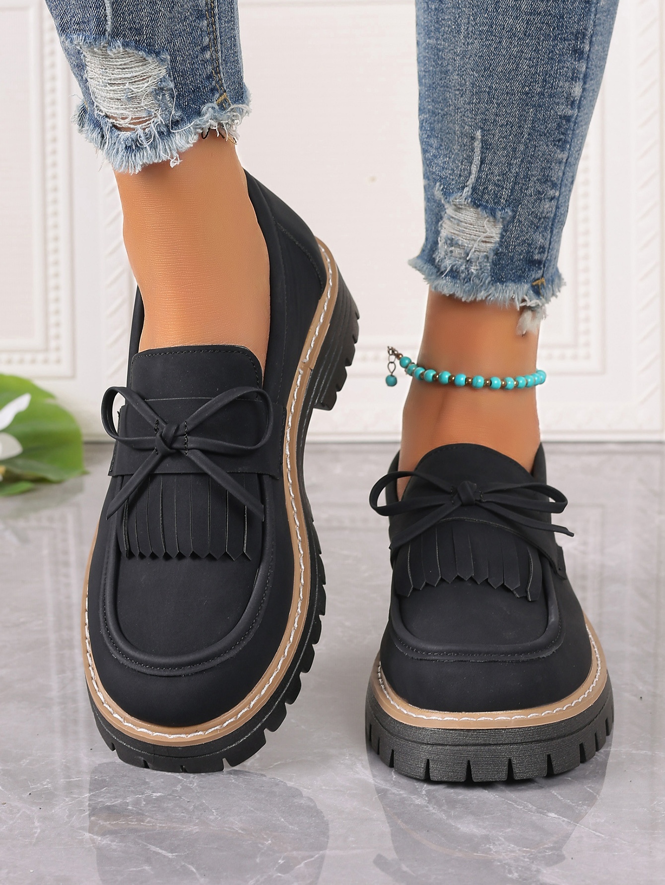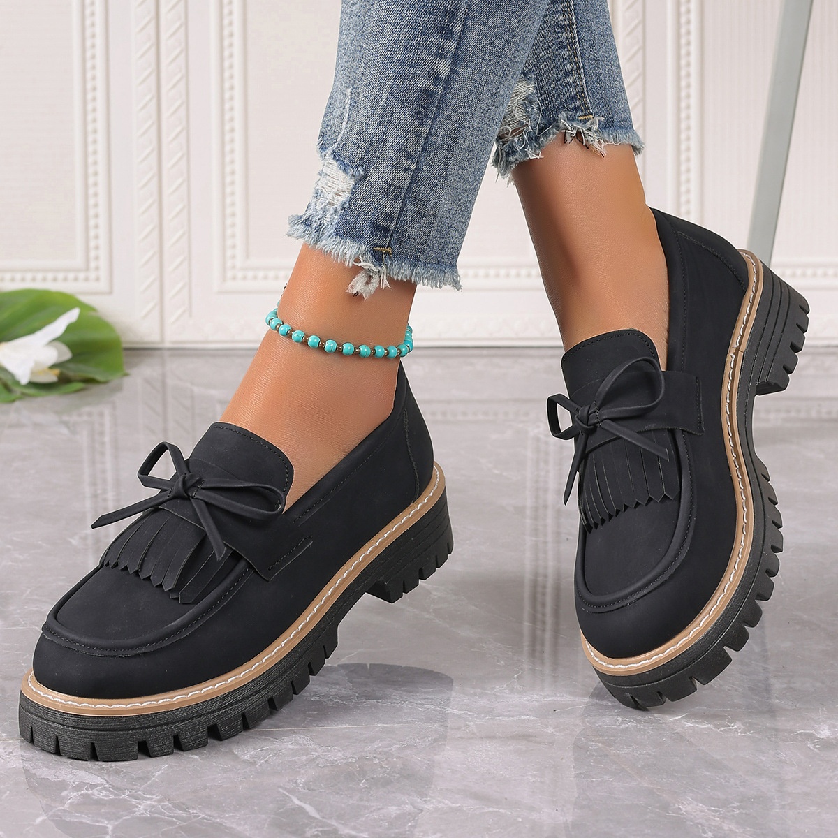 Plus Size Loafers Women Tassel Thick Heel Bowknot